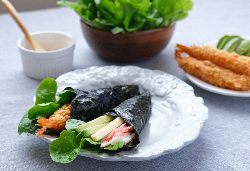 • 海苔の上にご飯とお好みの具材を置き、巻いて完成。